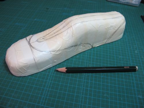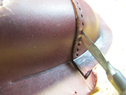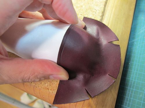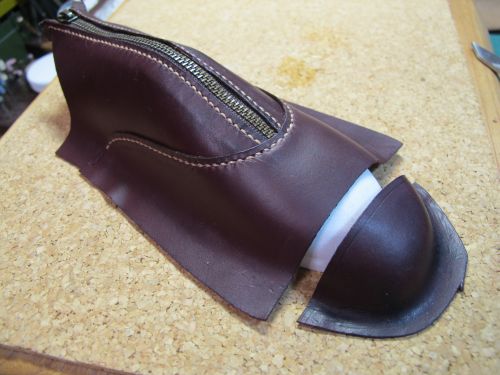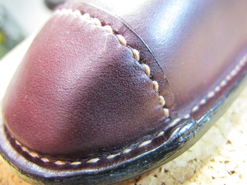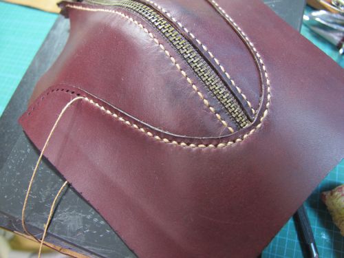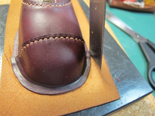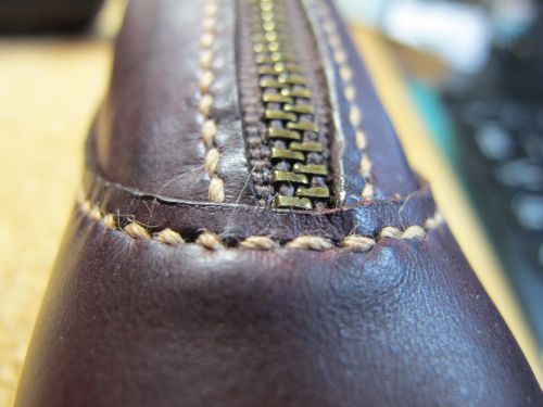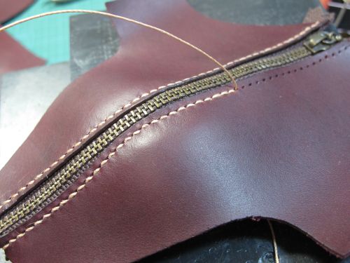 靴型ペンケース(2013)製作工程![]() 紙粘土で型を製作します。 手で成形後、サンドペーパーで形を整えます。 マスキングテープを極力皺にならないように張ります。 狙いのデザインをイメージしながら、パーツの縫い目を描きます。 2で描いた線の上にカッターで切れ目を入れ、破かないように一つずつはがします。 外した型紙を紙に張り、それぞれに縫い代を加えて描きます。 部品の重なり部は5mm。靴底部分は大目に20mmを加えています。 型紙を使い革を裁断します。 今回は柔らかい仕上がりを狙い、革は手触りのいいイタリア製のブルガノ。薄めの肉厚1mmを使用しています。 ファスナーと革を縫います。縫い方は革と同様です。 縫い代は5mm設けましたので、ステッチは端面から2.5mmとします。 つま先部分は曲率が小さいために形状を出すのが難しいです。 ここでは、このパーツをどっぷり水に浸し水分を含んだ状態で型に合うように指で形成します。 革は水を含むことで伸びやすく形が残りやすくなります。形成後は革が固くならないように オイルを十分擦り込んでおきます。 接合した部品も型に押し当て形状を整えます。 立体部分は型に押し当てたまま、菱目打ちで穴を加工します。 靴の製作と同様にアッパーをまず完成させます。 へらなどで押しながら、アッパーと靴型の端面が合うように形を出し、 縫い代を5mm程度残し外周を切り落とします。 底に使う厚めの革に接着し、外周を合わせて切り落とします。 アッパーと靴底の合わせ部分を縫い完成です。 |