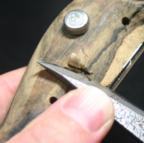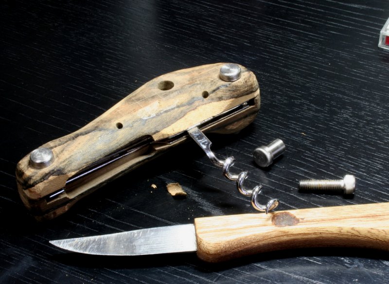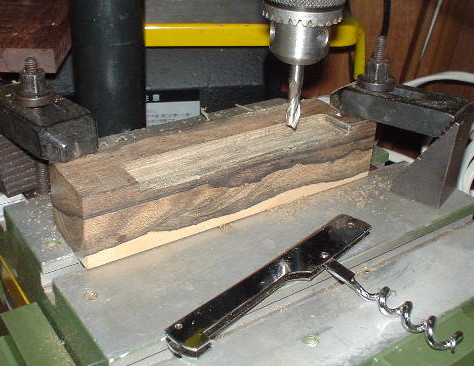 黒柿のワインオープナー(2006)製作工程(以下の手順は、本来の道具の使い方と異なる部分もあります。実施の際は個人の責任で安全に充分注意を払ってください。また完成品の性能・耐久性についても検証できていませんので注意ください。) ![]() 東急ハンズで購入した黒柿の端材を使います。 黒柿は樹木の名称ではなく、柿の木が齢を重ねると内部の金属や微生物の影響によって、 稀に現出する黒い模様を持った材としての呼び方です。 希少性が高いため古来から食器、茶道具など広く工芸に使われてきたおなじみの銘木。柿は硬度が高く以前ゴルフのドライバーヘッドとして 使われてきたのは有名。その際乱伐されたのも資源不足の要因と言われています。 写真は、ワインオープナーの金具を位置決めするポケット形状をフライスで加工している工程です。 ![]() 形状加工です。握りやすい形状をナイフで形成します。曲面を形成すると黒柿特有の模様が複雑に現れてきます。 ![]() |
