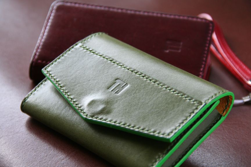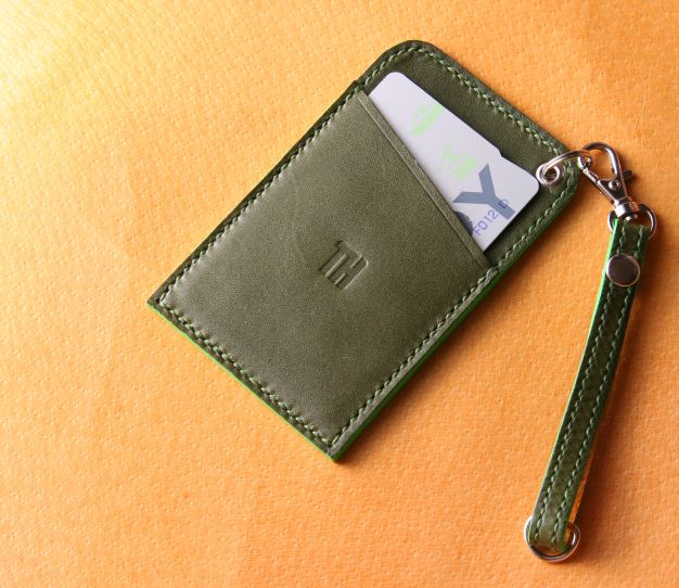 (オリーブ色)を使用したカードケースです。ステッチもグリーンで統一しています。