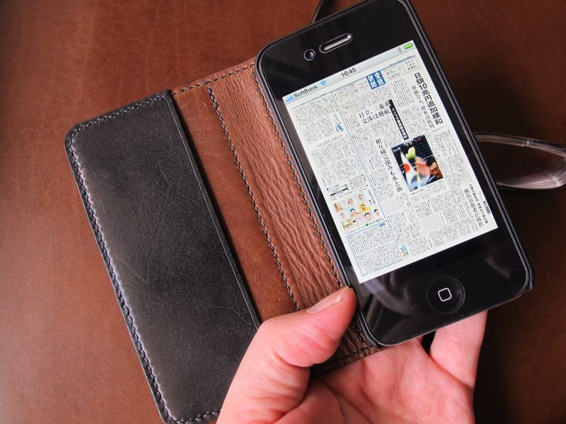 サドルレザーを使ったiPhone4用カバーです(横開き)。市販のハードケース(ソフトバンク純正)を活用しています。