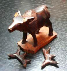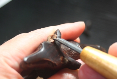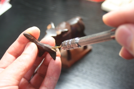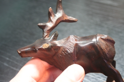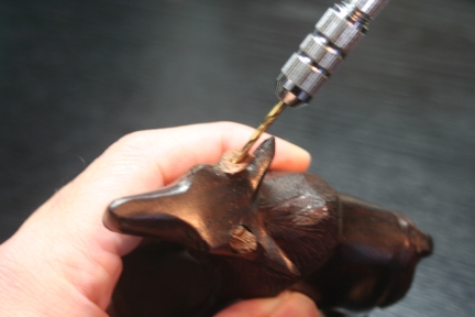 鹿の角補修工程![]() ![]() 意外に木が脆いため、破損を防ぐため電動工具は使わず、ハンドドリルで穴を開ける ![]() ![]() φ2の真鍮の丸棒を挿入し位置決めする。穴芯はずれるためスキが発生する。 スキの量を目視確認する。 ![]() スキ一定となるように接合断面を削り、あわせ調整を繰り返す。 ![]() とりあえず完成とする。接着剤は使わず脱着式の角とする。 |